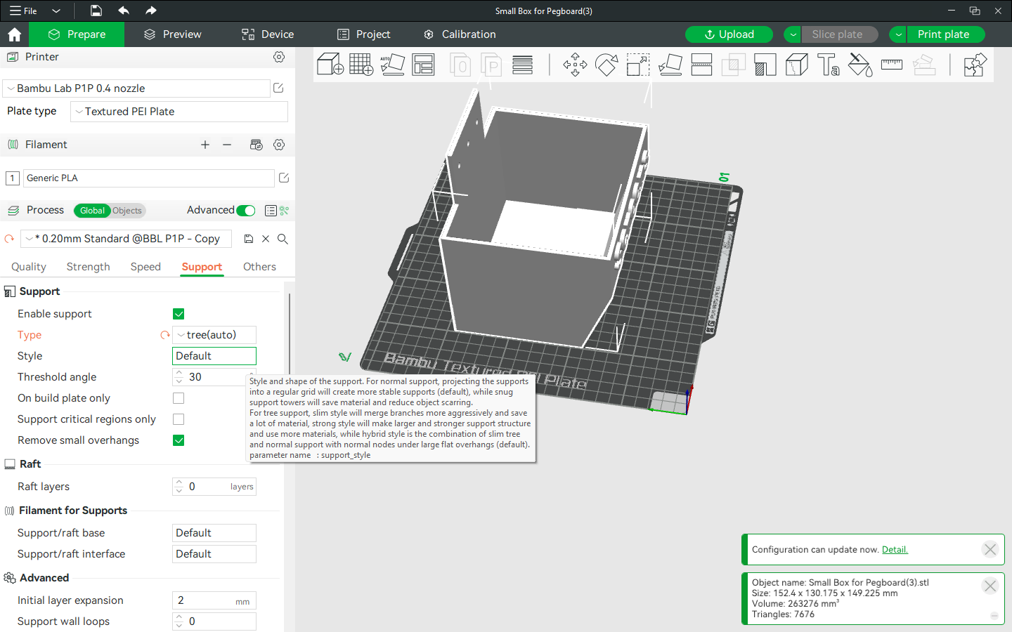 I created some storage bins to hang on the pegboard in the garage. The models looked great, and I had already printed a test square to make sure that the holes were sized and aligned correctly. It was time to print them, which meant time to figure out what kind of supports to use.