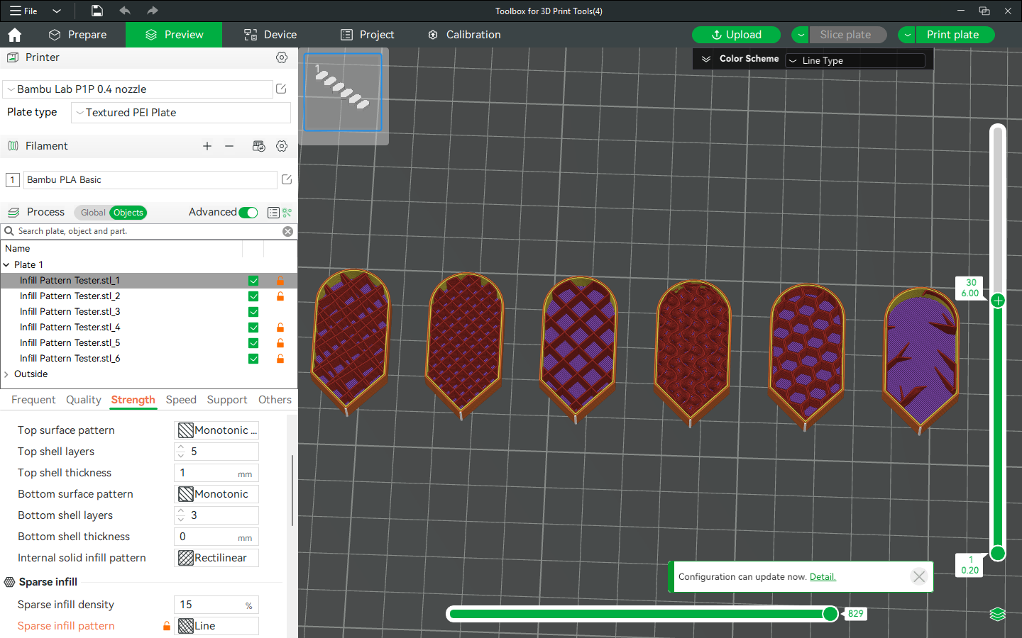 I lined up six identical shapes, then applied a different infill pattern to each one. In order they are Line, Rectilinear, Grid, Gyroid, Honeycomb, and Lightning patterns. Halfway through the print I’m going to stop it, then share the results.