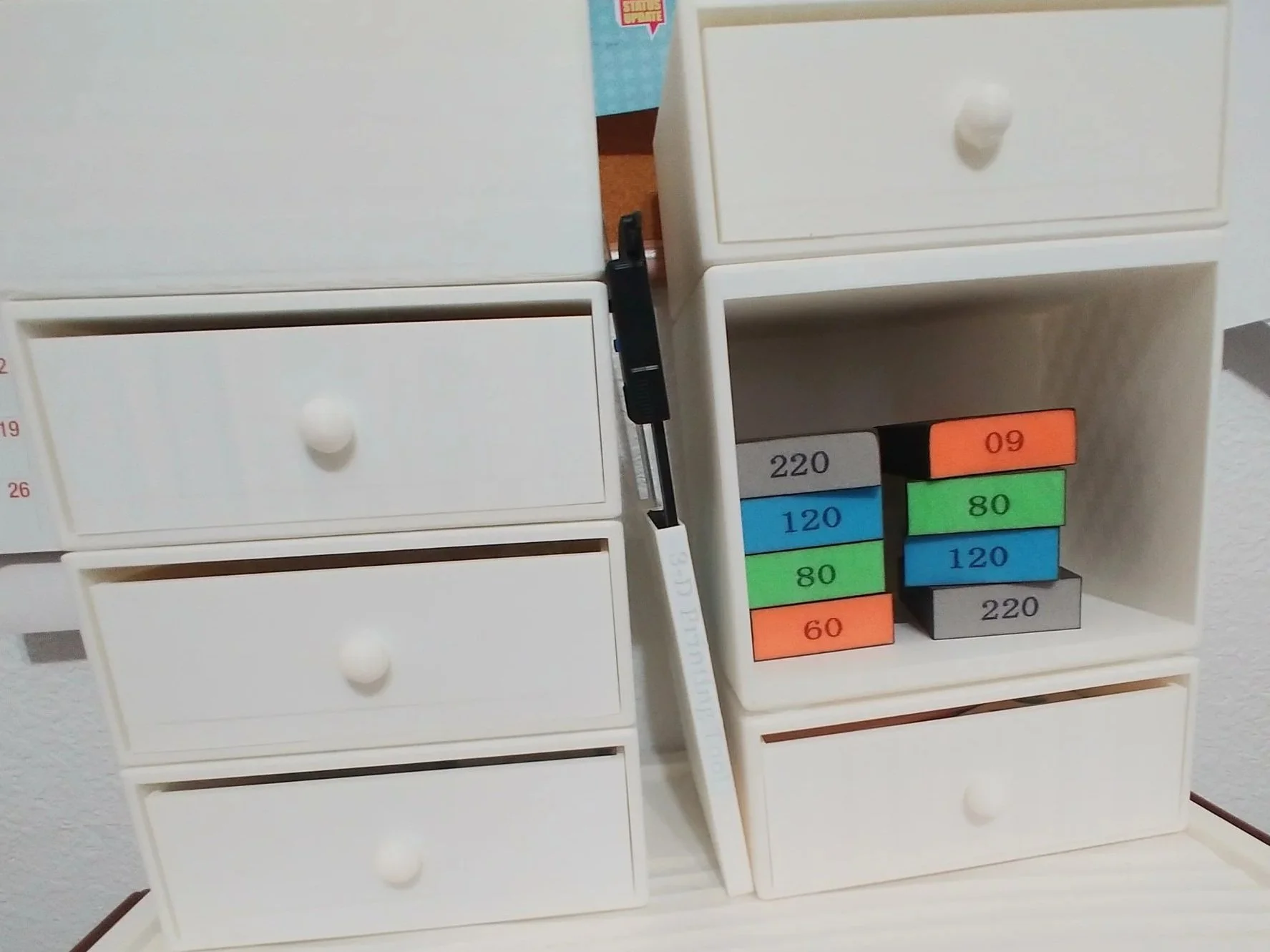 The super-glue drawer is now more of an ‘accessories’ drawer, as it also contains stick-on beads, a thick wad of string, a 3D printed glue-spreader, and two different sizes of 3D printed balls for lazy susans and the like. While the string and glue are used to help build things, I got the beads for decorating a shelf, then decided not to use them.